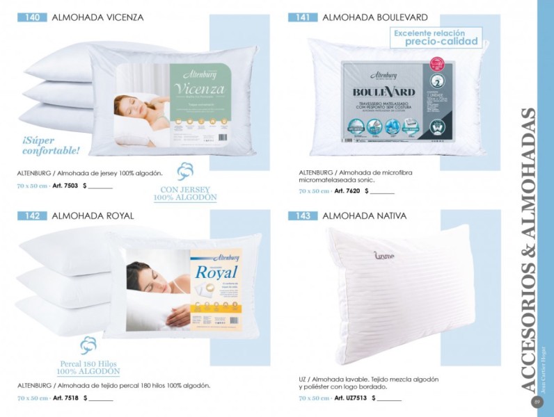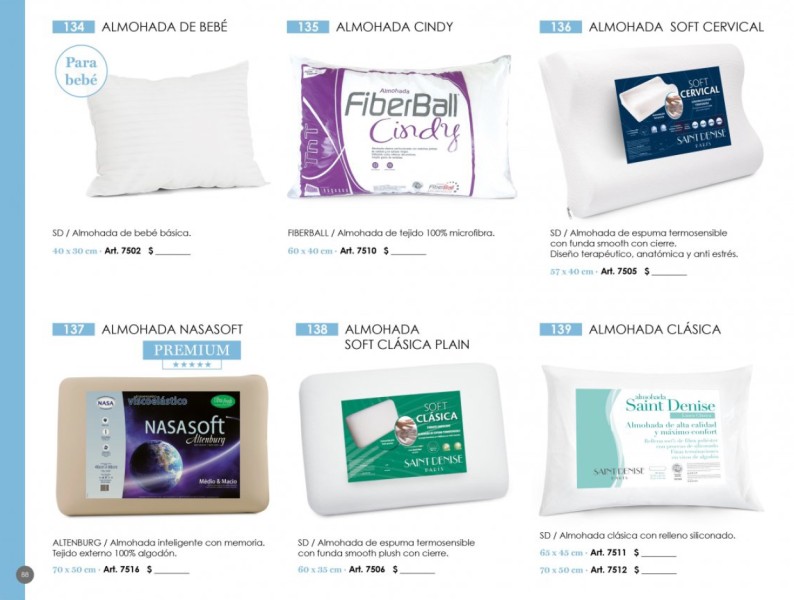 - Almohadas: Antiestrés, con memoria, anatómicas, antialérgicas y lavables.