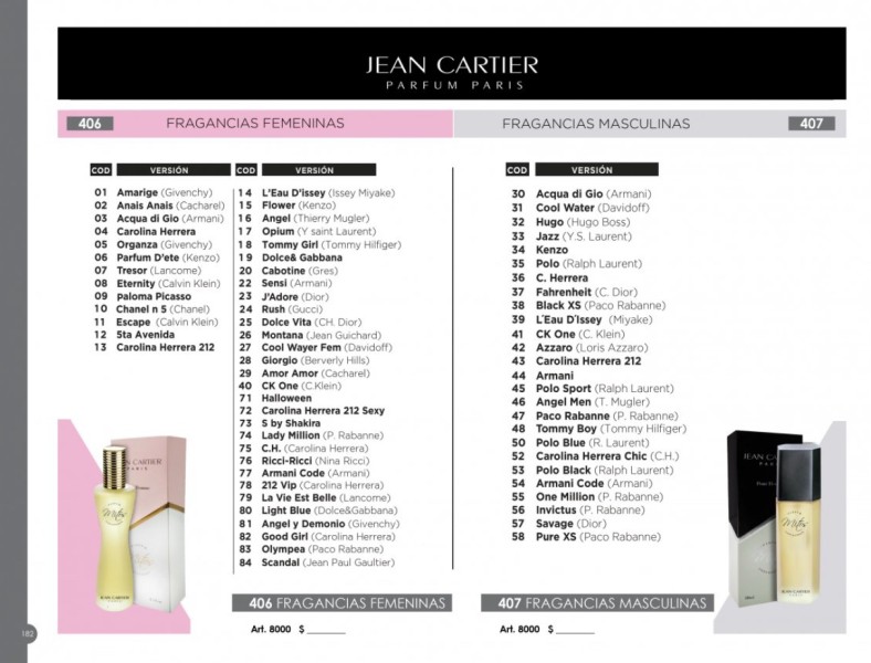 Jean Cartier, Alcoyana, Danubio, Cacharel, Casablanca, Franco Valente, Cannon, Hausman, Kavanagh, Arco Iris, Santista, Palette, Pierre Balmain, Fiesta, Viridiana, Piñata, Camaro, entre otras.