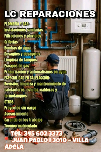 Ofrecemos soluciones integrales en plomería, gas, calefacción, aire acondicionado y reparación de electrodomésticos. Somos especialistas matriculados, con amplia experiencia y garantía en cada trabajo realizado. Nos encontramos en Juan Pablo I 3010, Villa Adela – Concordia, y brindamos atención personalizada a domicilio.